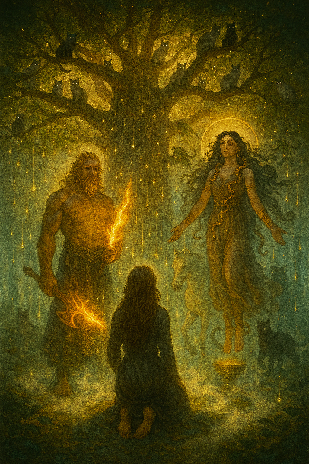 Le souffle de l'Univers semblait s'être suspendu. Je me tenais au seuil du rêve, là où le sommeil devient passage. Devant moi, l'Axis Mundi s'élevait comme une colonne vivante de lumière, un pilier de mémoire et de feu. Tout autour de moi, les voiles du monde se déchiraient telles des toiles d'araignées millénaires. Et là, dans l'espace entre les plans, je les vis…